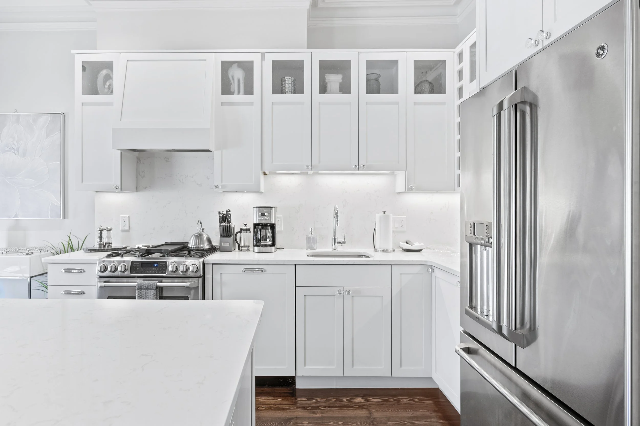 Renovated top-to-bottom in 2016, our unit features a wide open living space, dining and kitchen areas with gorgeous refinished original pine floors, dramatic 11-foot ceilings, exposed brick, brand new top of the line appliances, a built-in microwave drawer, white custom kitchen cabinets with white quartz countertop and backsplash.